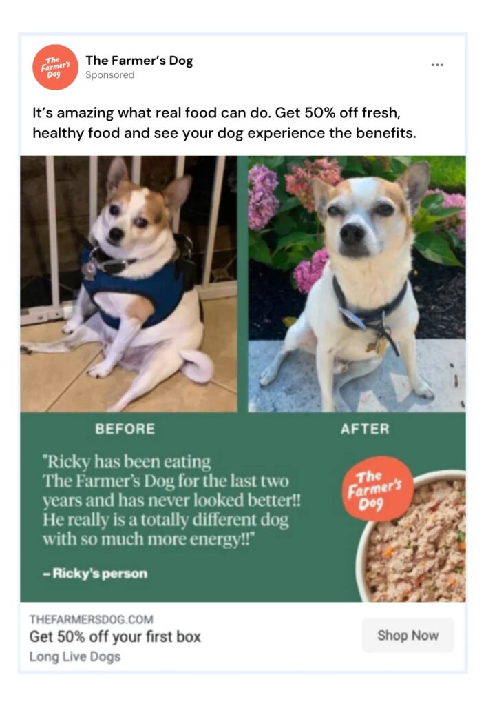 This popular dog food brand is known for its nutritious, high-quality, fresh ingredients. When picking between kibble and fresh food for dogs,health is typically the number one priority, so Farmer’s Dog leveraged a positive review from a customer who stated how their dog, Ricky, is in the best shape he’s ever been since feeding him The Farmer’s Dog food.